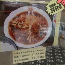 なんともなしに入った日高町富川の農協。何か食べ物をと思い入ると、そこに一軒のそば屋が。普通は、絶対入らないのですが、メニューに気になるものが…。えびととんかつのカレーあんかけ。エビフライととんかつは嫌いな人がいないメニュー。それに万人に愛されるカレー?しかも、あんかけ?カレー自体とろみがあるのであんかけでは?様々な疑問がわいてきて気になってしょうがないので入ることに。出てきました夢の食べ物。メニューでも期待大だったのだが出てきたものは、その期待以上のもの。これには恐れ入った。そびえたつエビフライを支えるようにカレーにつかるとんかつ。ここはそば屋なので