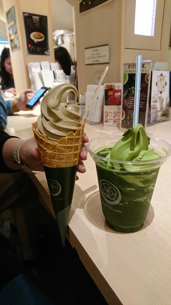 ほうじ茶ワッフルコーン470円と、特選グリーンティフロー520円を注文。