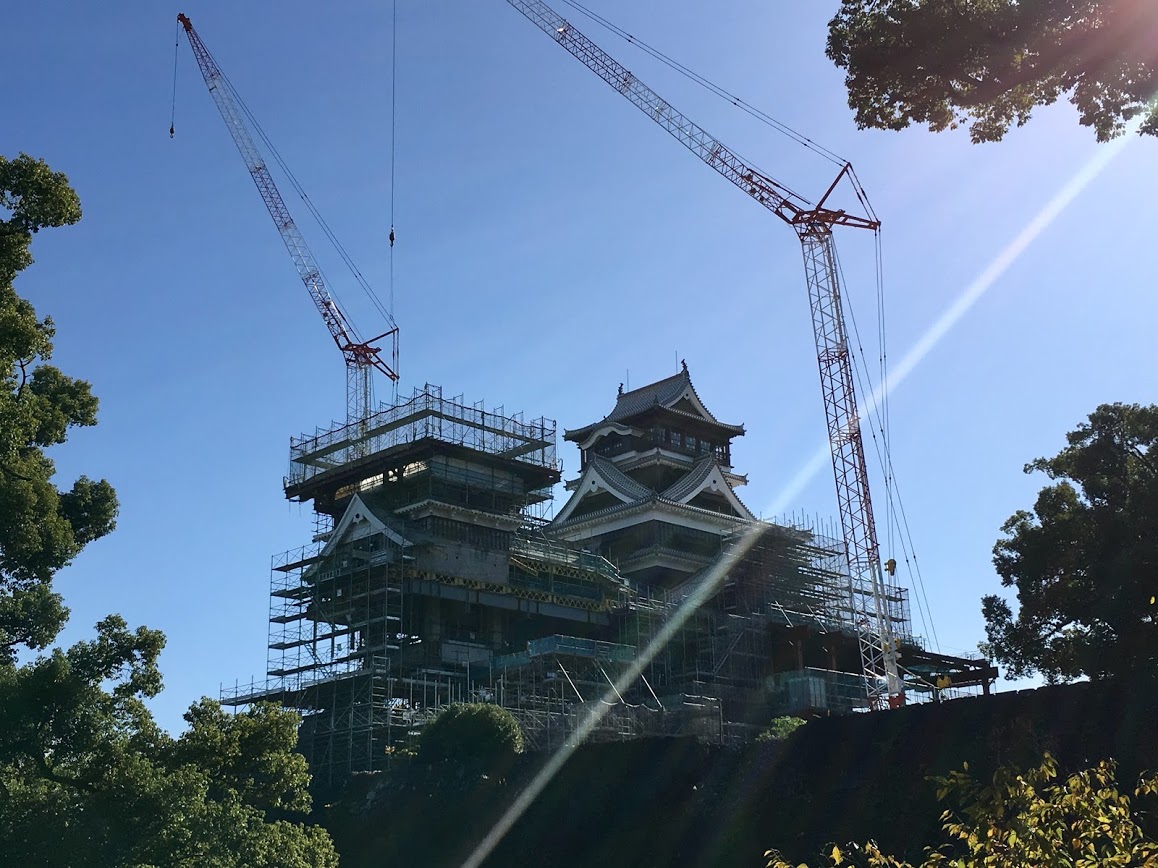 現在修復作業中の為、外からしか見れませんでした。崩れ落ちた石垣やクレーンは少し痛々しくも見えますが、いつか必ず修復が終わった後に再来したいと思います。近くの市役所には14階に展望台があり、全景を見ることもできます。