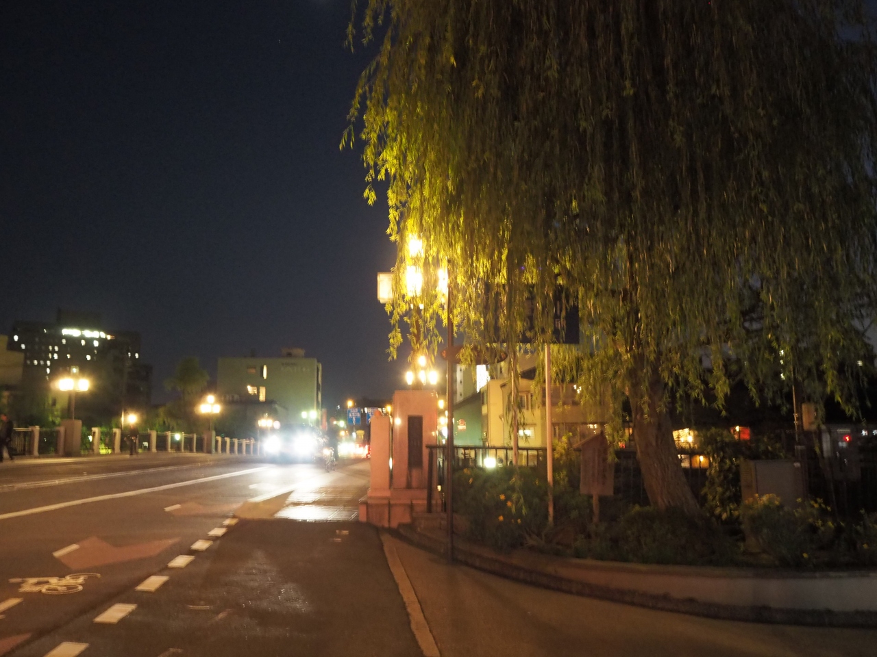 浅野側に隔たれた岸と岸を結ぶ大橋です。ひがし茶屋街で主要な通路になっていて、にぎわっているイメージがあります。今回、日が暮れてから大橋を通りましたが、片側2車線の大きな通りで、遊歩道も完備されているので歩きやすかったです。橋は狭い感覚で街灯がついているので安心です。