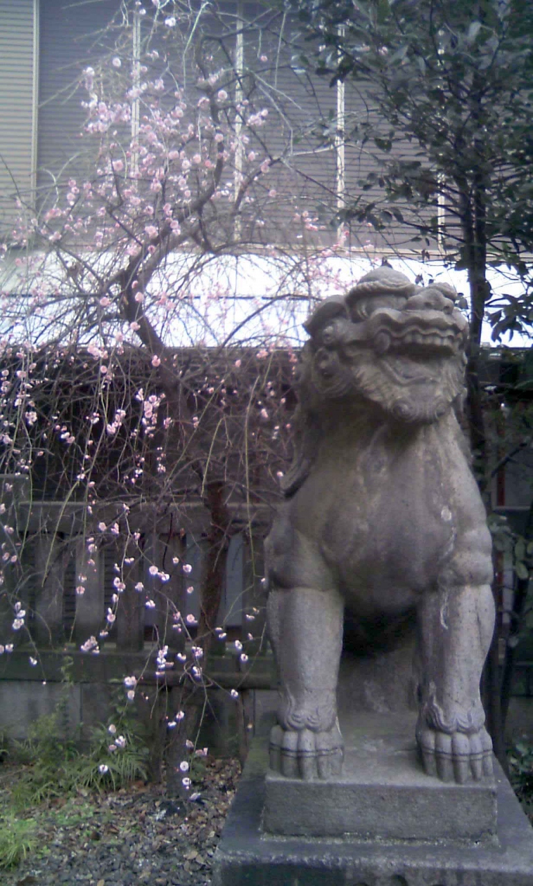 狛犬のすぐそばで梅が咲き、台座に「戸久津」という文字が彫られていました。