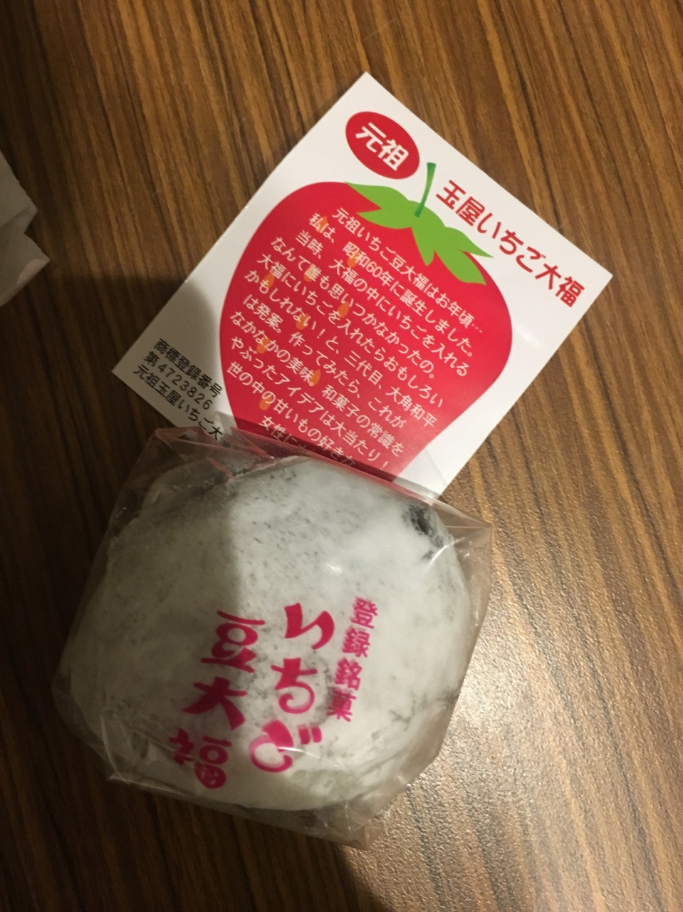 いちご大福を購入しました。ちょうど年末ジャンボ宝くじの季節だったため、こちらのお店でも限定で金色の特大いちご大福が発売されていました。この日は売り切れていたので普通の苺大福を購入。金色の苺大福を年末ジャンボ宝くじを持っていると300円引きしてくれるそうです。