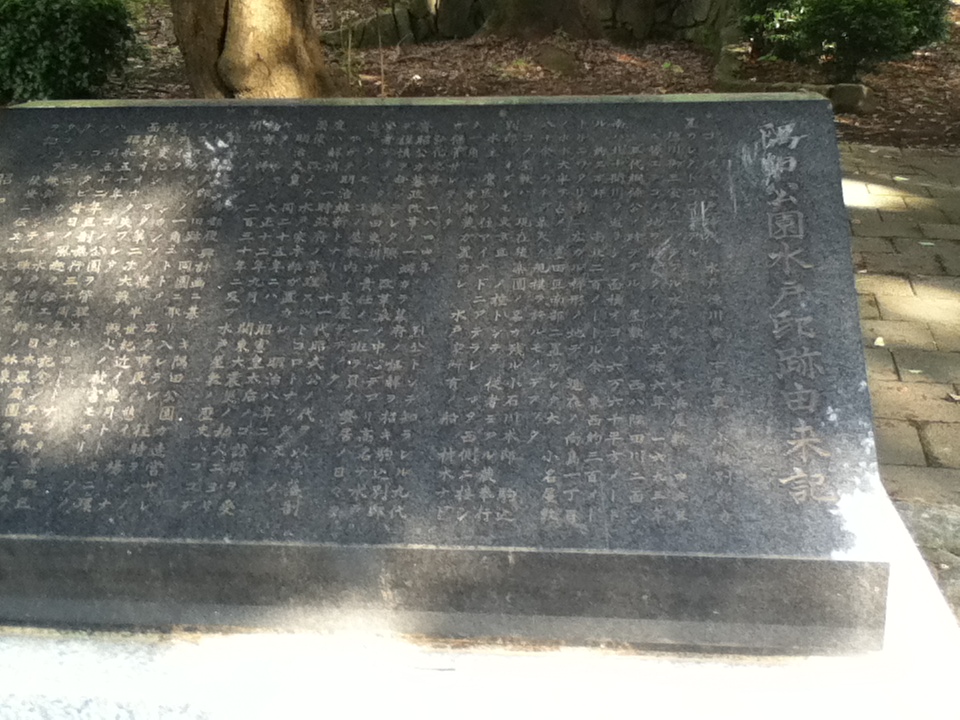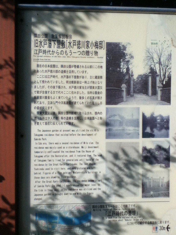 旧水戸藩下屋敷石碑は隅田公園内にある。石碑には名称と長い碑文が刻まれている。お勧めの点は、江戸時代、隅田川や北十間川の交差部に水戸徳川家の下屋敷があったこと、そこには広く庭園があり当時の重要人物が多く訪問していたこと、近年になり隅田公園と整備されこの日本庭園も綺麗に維持管理されていること、庭園では池や木々があり散策や休憩を楽しめること、特に日本庭園で散策や休憩を楽しみたい人や、日本庭園や水戸藩に関心のある人にとっては訪問する価値があることである。
