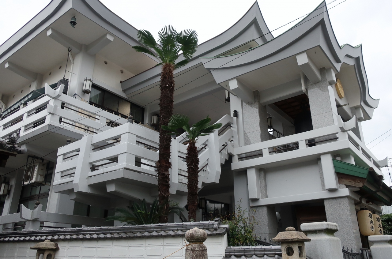 国道2号沿いに建つお寺だが、何より目立つのはその姿だ。真っ白な鉄筋コンクリート造りで、しかもさまざまな屋根を組み合わせた複雑な形をしている。敷地ぎりぎりに建っており、歩道からすぐに本堂の入り口。あとから聞いたが、明治時代に鉄道が開設された際、尾道の町をレールが分断する格好になったが、その中で唯一、鉄道以南に残った寺院だという。