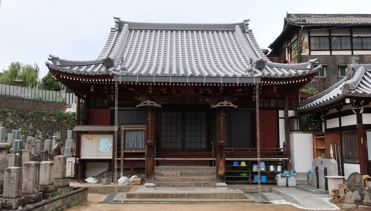 参道の幅は狭いが、豪華な楼門があり、印象的な入り口だ。尾道に集中的に存在している「時宗」のお寺。見ることはできなかったが、現地の説明板によると、本尊の阿弥陀如来坐像は全国的にも珍しい半跏座で、全国でも珍しい姿だという。境内には「延命井」という泉が湧いており、くみに来る人が多いとか。帰途は墓地を通って上にある久保八幡神社に抜けた。