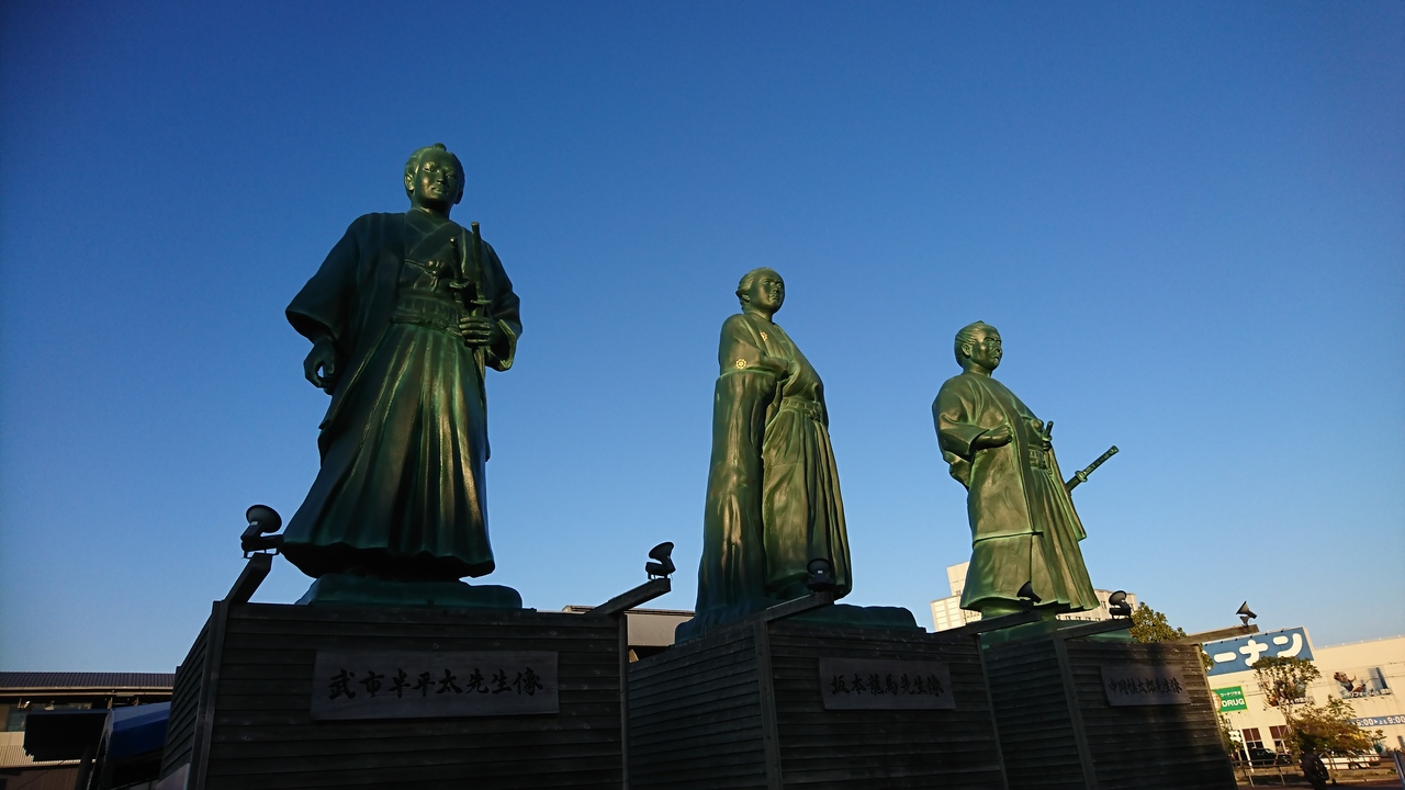 幕末に活躍した三志士が坂本竜馬を真ん中に立って迎えてくれています、銅像の裏側には説明もあり人物像が分かります、高知駅出てすぐなので記念撮影にも手軽な場所だと思います、銅像の近くには観光案内所もあり高知観光の出発点に良い場所だと思います。