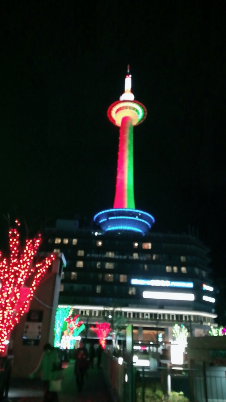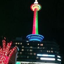 夜のライトアップが綺麗、日によってテーマカラーライトアップもしています。個人的には京都駅に映る京都タワーが好きです。