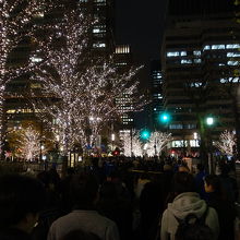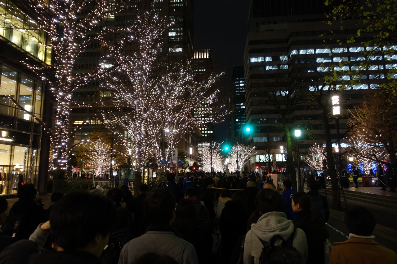 年末には「東京ミチテラス」と称して、行幸通りがイルミネーションで飾られますが、その入口となるのが「丸の内仲通り」です。係員の指示のもと、丸の内仲通りに整列して順番を待ちます。仲通りも少しですがイルミネーションが施され、普段にもましてお洒落な雰囲気が漂います。冬の風物詩的な光景でした。