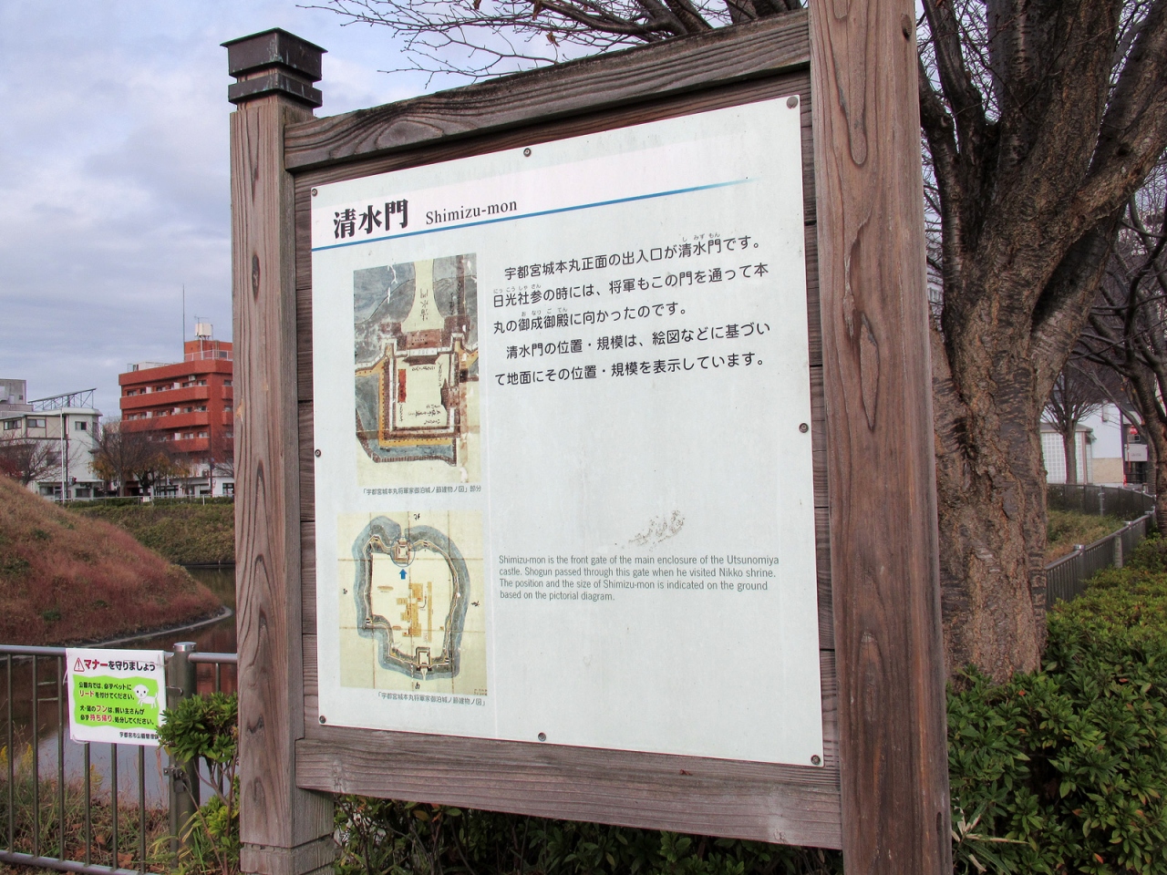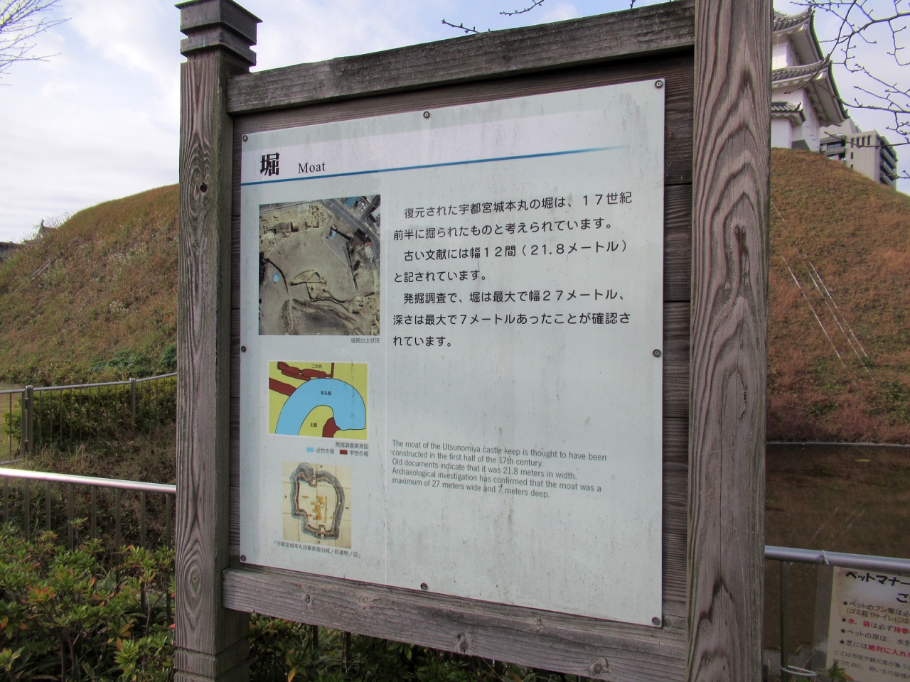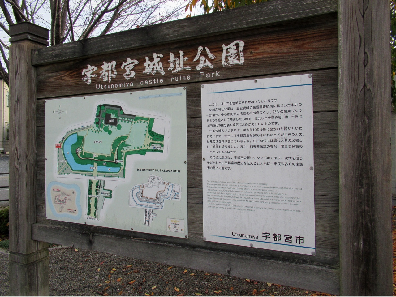 戊辰戦争で破壊され、また第二次世界大戦後の再開発で消えつつあった宇都宮城の土塁などを生かし、櫓や土塀などを復元するなどした本丸西側の一部が、宇都宮城址公園として整備・公開されています。大きくて高さのある立派な土塁が印象的な城郭であったことが分かります。北側には清水門の跡が線で示され、大きな土塁上には清明台と富士見櫓(定期開放日には2階にも上れます)が復元され、地上部分には「宇都宮城ものしり館」・「まちあるき情報館」が設けられています。その「宇都宮城ものしり館」にはボランティアガイドの方が常駐されており、解説を聞くことができました。東側には歴史展示室である「清明館」が建てられていて、書籍・パンフレット類も購入することもできます。