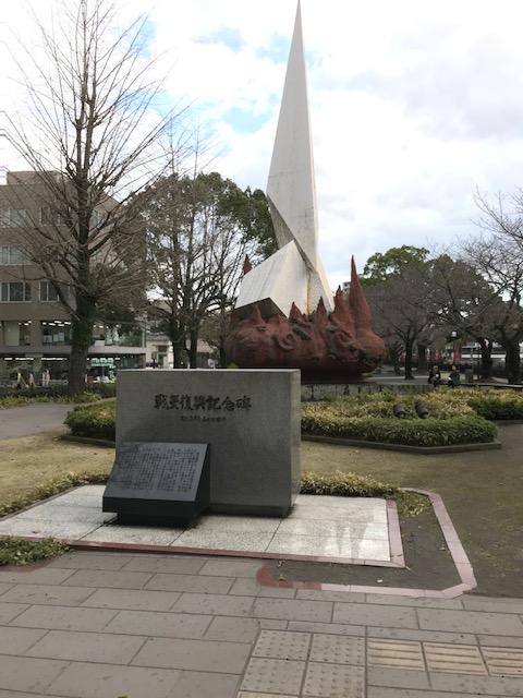 鹿児島中央駅の大久保利通像から歴史ロード 維新ふるさとの道を維新ふるさと館に向かって行くと、この戦災復興記念碑がありました。大久保利通生い立ちの地よりも手前です。とても変わった形のモニュメントなので説明書きを読むと、太平洋戦争で鹿児島が大変な目にあったのを知りました。モニュメントの形からは復興の力強さを感じました。