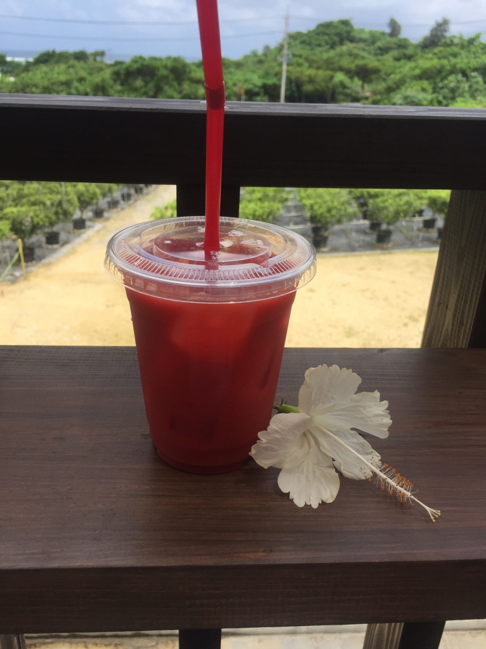 美ら味堂さんの畑で作っているアセロラで使ったジュースが売りのお店です。年に何度もアセロラが取れるとか。かなりへんぴな場所にありますがお店から見るオーシャンビューは最高です。