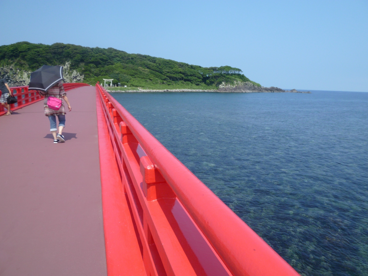 東尋坊から見えた島で、赤い橋が見えたので行ってみました。雄島橋は赤く立派な橋で、島まで続いています。途中の海は穏やかで、水もきれいで、波音が静かに聞こえとても気持ちいいでした。島は無人島で、入り口に鳥居があり、階段を登ると神社がありますが、整備されていなくあまりお勧めできません。島内を1周できる遊歩道はありますが、整備が良くないので、特に行かなくてもいいかも。橋から海を見て、島の入口付近で折り返しでいいでしょう。