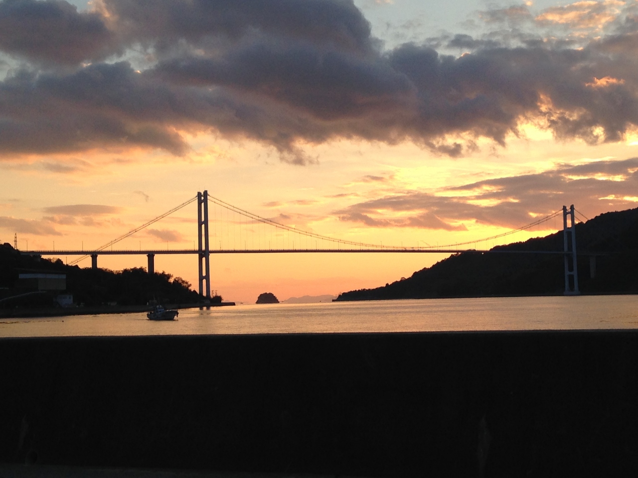 美しいと思ってしまう吊り橋でした。瀬戸内の風景に溶け込み、素晴らしい光景を造り出しています。橋の上からの眺めも良く、瀬戸内海の島々と海に浮かぶ船などがきれいに見えます。夕暮どきに訪れたのですが、夕陽を背にした光景が、素晴らしかったです。