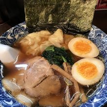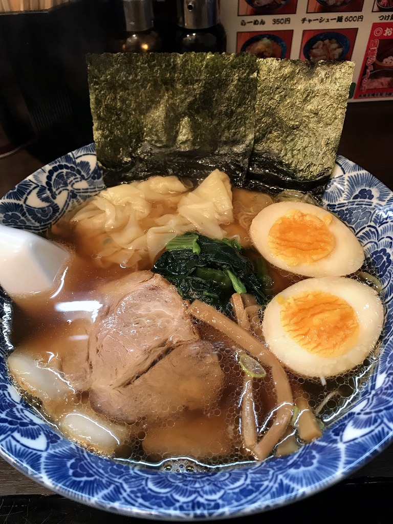 チャーシュー大2枚、肉厚ワンタン3個、味付玉子、海苔大2個がトッピングされています。
