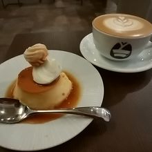 「プリン」500円(税込)と「ラテ」500円(税込)を注文です。ラテもこんもりとキレイ♪プリンには、クリームと、メレンゲのお菓子が乗せられています。カラメルは、苦みのないカラメルなので、小さなお子様もきっと大好きなプリンです。