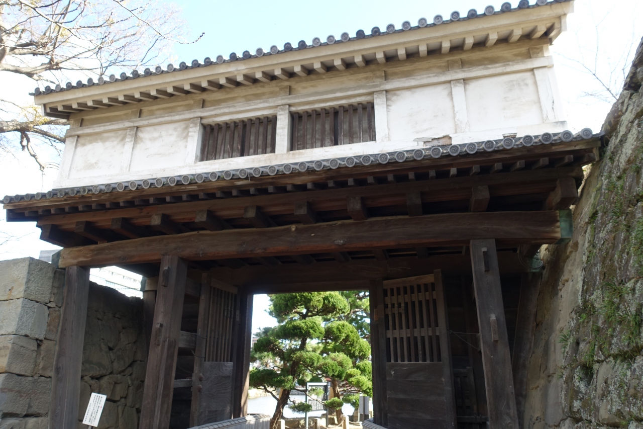 和歌山城にある門のうち、一番カッコいいと感じたのが「岡口門」です。お城の南東端に位置します。かつては大手門、すなわち正門だったそうで、いかにも堅牢で重厚な印象がありました。脇を取り囲む石垣も見事で、フォトジェニックな光景でした。