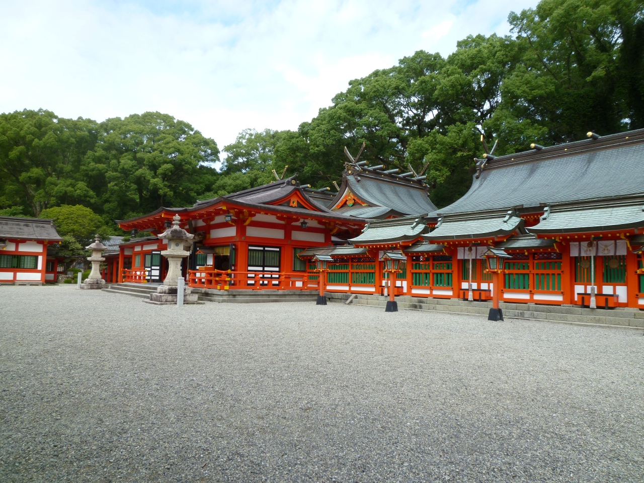 熊野川に近い場所にあり、御祭神は熊野速玉大神と熊野夫須美大神で熊野三山のひとつです。入口には朱色の鳥居が目立ち、参道もきれいです。なぎの大樹があり、山門の大きなしめ縄は圧倒されます。山門からは砂利を進み本殿に向かいます。白い壁と朱色の柱がとても鮮やかな神社です。ここから近い神倉神社も合わせて御朱印がいただけます。