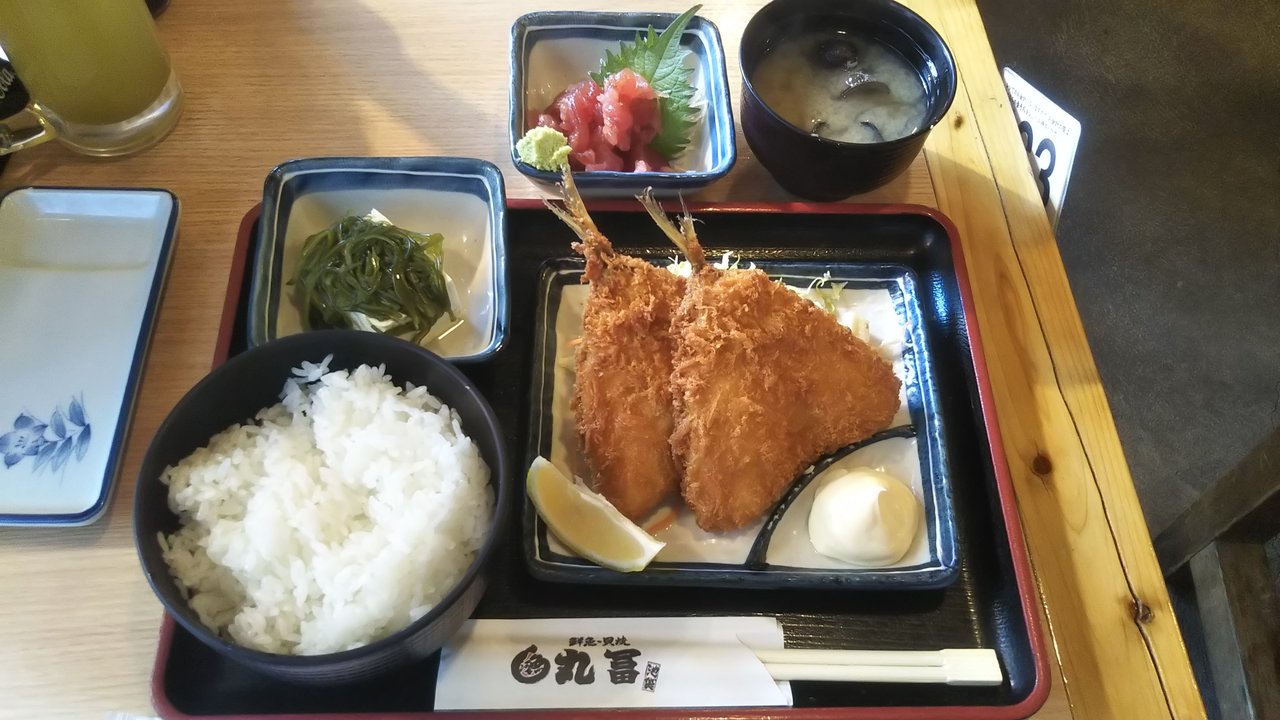 注文した名物のアジフライは出来立てアツアツふっくらと肉厚な魚の身がとにかく美味しいです。