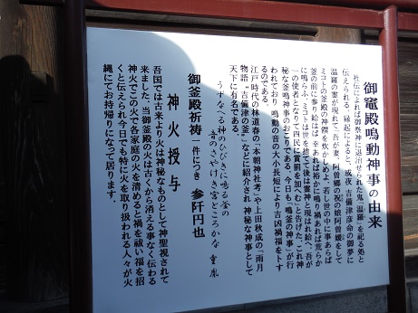 御竈殿(吉備津神社ではこのように表記されていました)は、鳴釜神事の行われるところです。御竈殿の釜の下に吉備津彦の命が退治した「温羅」の首を埋めたところ、13年間にもわたってそのうなり声は止まず、ある夜、命の夢に「温羅」があらわれ、「吉凶を占おう」と言ったことから始まったそうです。金曜日は休みということでした。