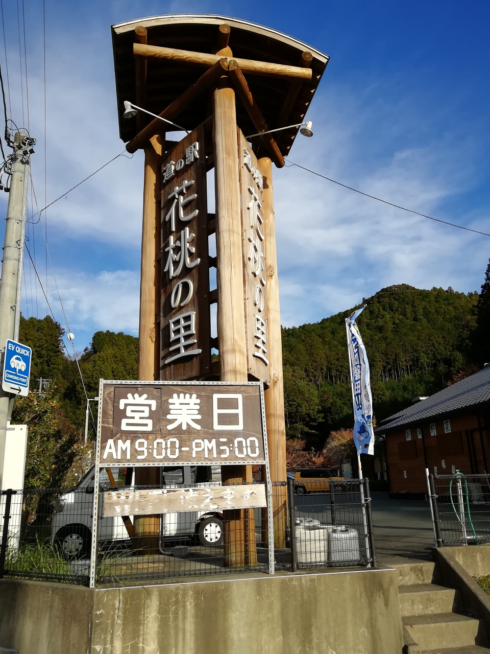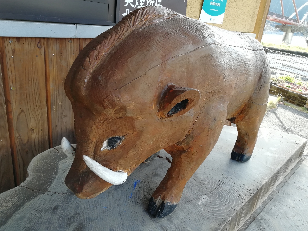 秋葉山本宮秋葉神社を参拝して下山する途中にあった「道の駅 天竜相津花桃の里」で一休みしました。真横に大きな川(天竜川でしょうか)イノシシの置物もありました。早朝でしたのでまだお店はやってませんでしたが、地元の特産品などもあつかっている様です。