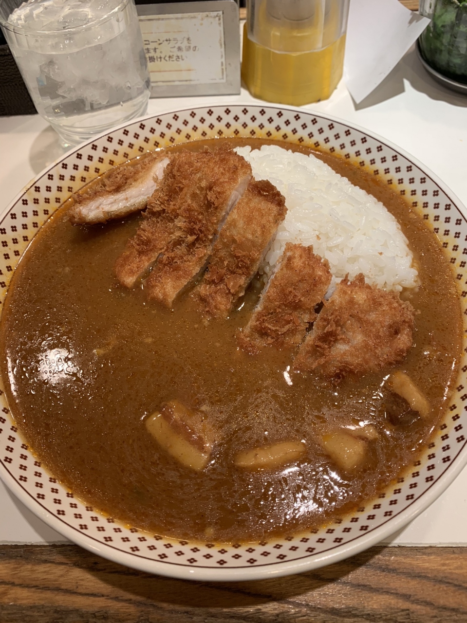 小腹が空いたので 紀ノ国屋書店の地下にあるカレー屋さんへ。カウンターのみでメニューは思ったより多め。私の時はチーズカレーにはドリンク付きでした。今回は有名なカツカレー。かなり量があるサラサラの液体カレー。辛くするには50円プラスです。カレーは飲み物!