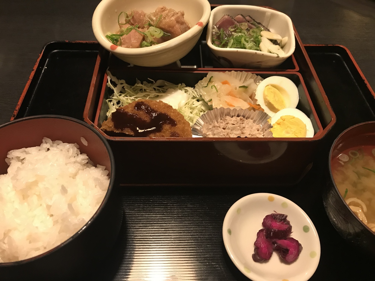 ぼっち旅行で、またお酒飲めないのでなかなか居酒屋へ行きにくいのですが、ホテルのスタッフさんに「ここはランチもやってますし、お酒飲まれなくても大丈夫ですよ」とのことで行ってみました。ランチのメニューも豊富で日替わりは高知名物カツオのたたきもはいってとってもリーズナブルでした。