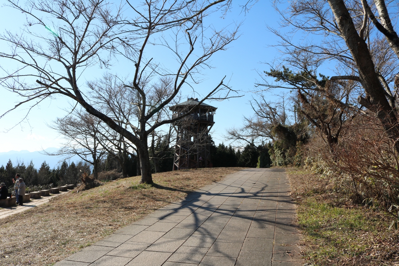 秦野市街から車で行きました。お正月も三が日を過ぎ、バス停付近の駐車場にはスムーズに入れました。快晴で、相模湾、伊豆半島、大島、さらに丹沢山系が一望できます。展望台に上がると、堂々とした富士山の姿が楽しめました。穏やかな午後、豆粒ほどのハングライダーの姿も印象的です。