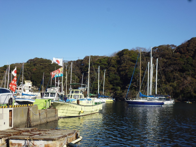 油壺マリンパークもある油壷は大きさもいろいろなヨットが停泊しています。ここは釣り人も乗せていく船も出るところですがこの冬の時期は静かです。