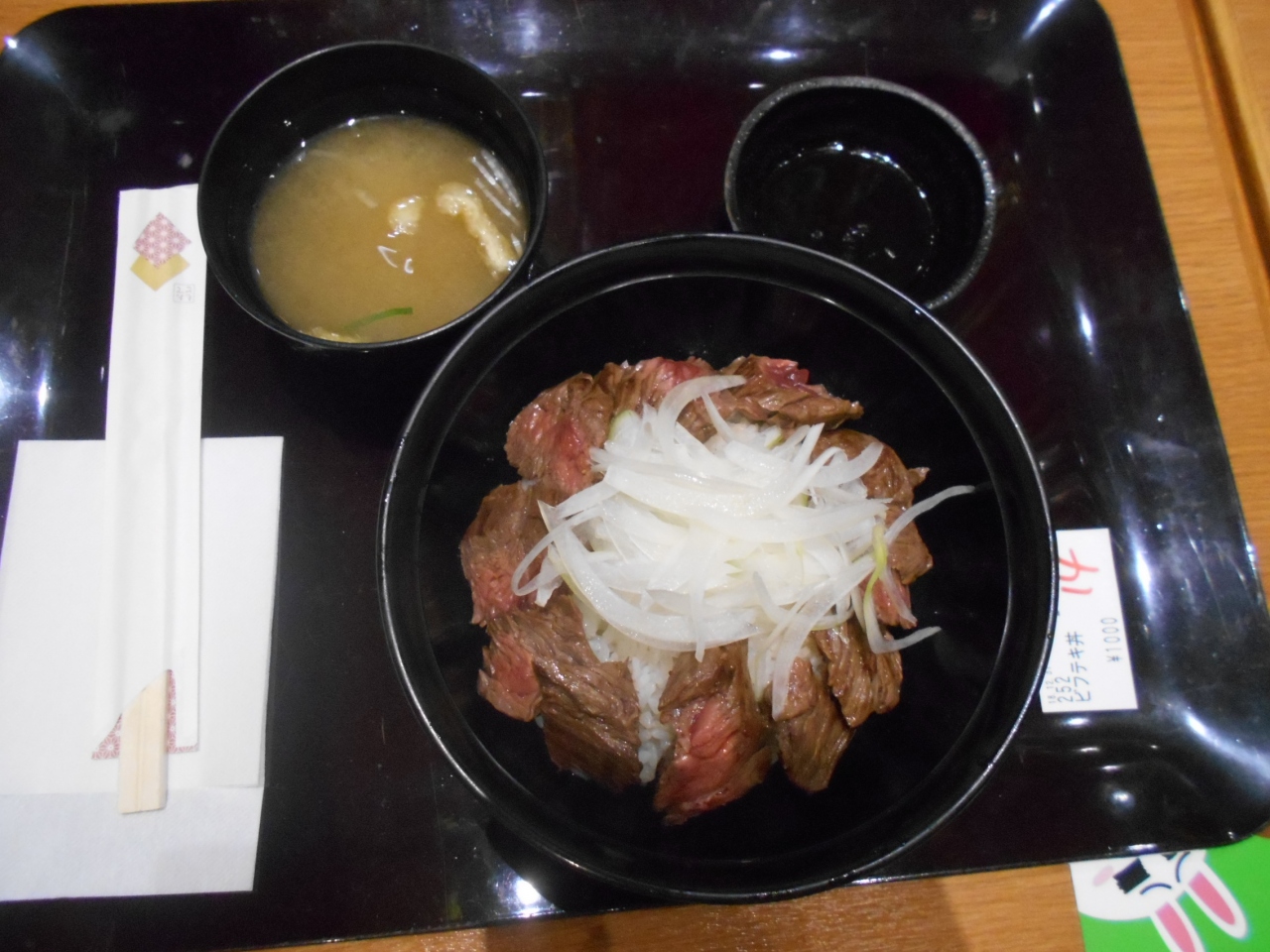 山盛りの唐揚げ丼に魅かれましたが今回はビフテキ丼にしました。(記憶があいまいで正式名称は違っているかもしれません)