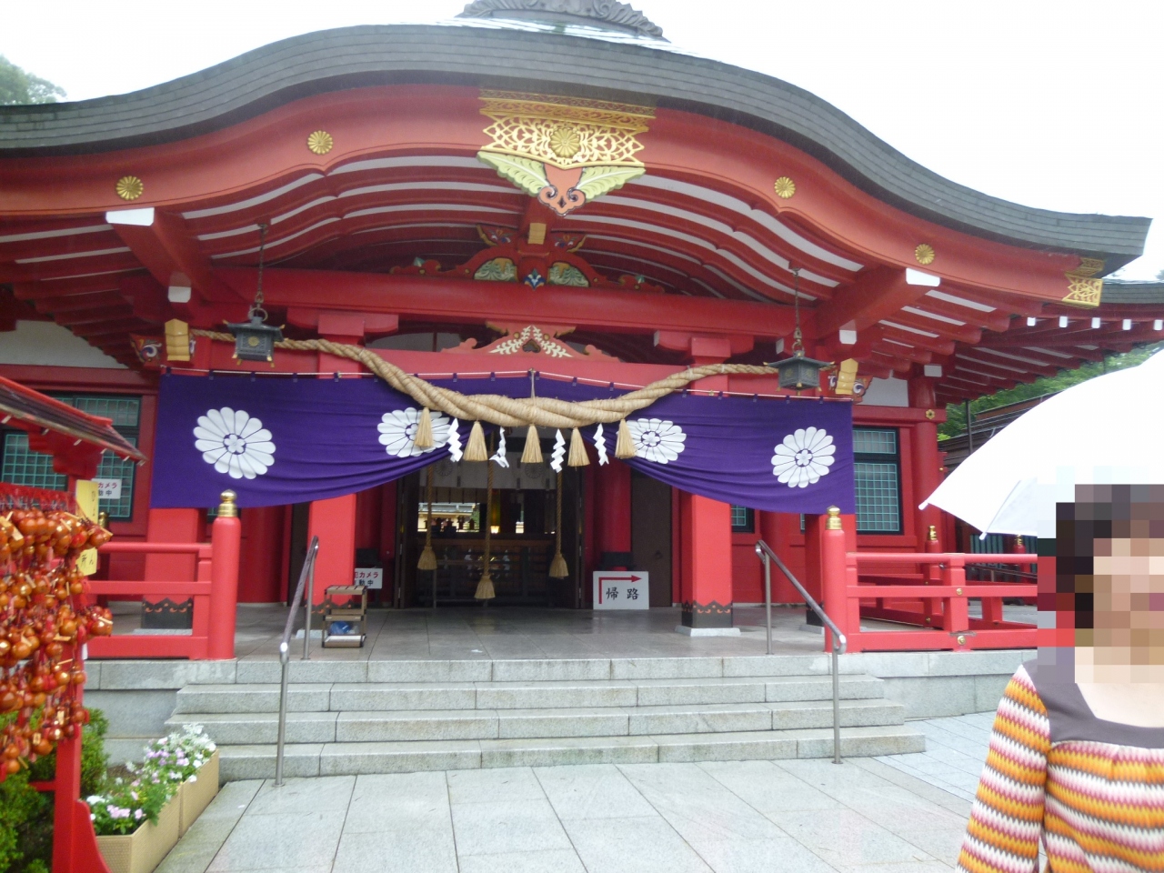 石段を登ると、朱色の本殿がきれいに見えます。参道は石で敷き詰められ、清潔感があります。護国神社なので、戦没者を慰霊する場所ですが、ひょうたんがつるしてあります。この中に悪い物を閉じ込め、栓をして吊るして帰るらしいです。なかなかおもしろいですね。