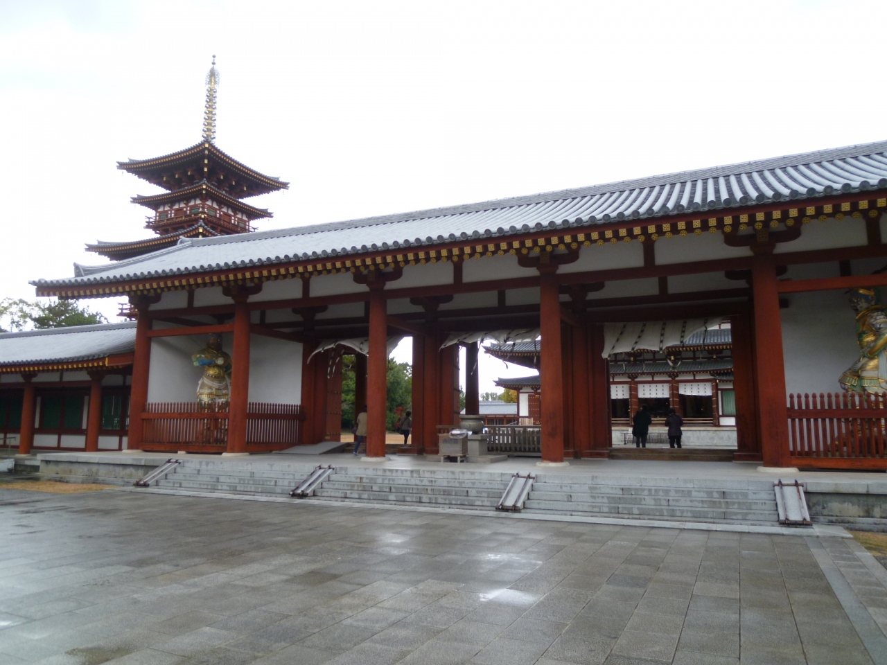 南門から入ると、朱色の門が見えます。それが中門で、左右に二天王像がきれいな鎧でにらみをきかせていて、かっこいいです。石畳の参道はきれいで、柱の朱色と白い壁であでやかです。奥に見えるのは金堂で、左右に見えるのが右が東塔、左が西塔の配置が見れます。