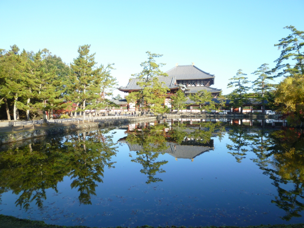 南大門から参道を歩いていると、右手にある池です。池の周りも歩けるのでいろいろな方向から池に映る風景を楽しめる事が出来ます。青い空と木々と大仏殿が池に映る様は、本当に鏡のようで、上下のコントラストは美しいです。