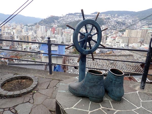 船の舵の前に大きなブーツが置かれています。靴を履いたまま足を入れることができます。龍馬になった気分で長崎の町を見下ろすことができます。