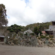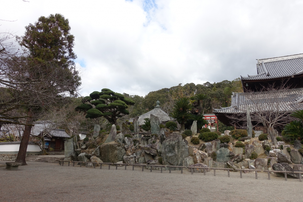 「粉河寺庭園」は、本堂の前にあり、大きな石を組み合わせて造られています。庭園越しに見る本堂の姿は素晴らしいと思います。12月だったので彩りには欠けていましたが、花咲く季節にはもっと艶やかな光景が見られるようです。この庭園を見るためにだけでも足を運ぶ価値があると思いました。