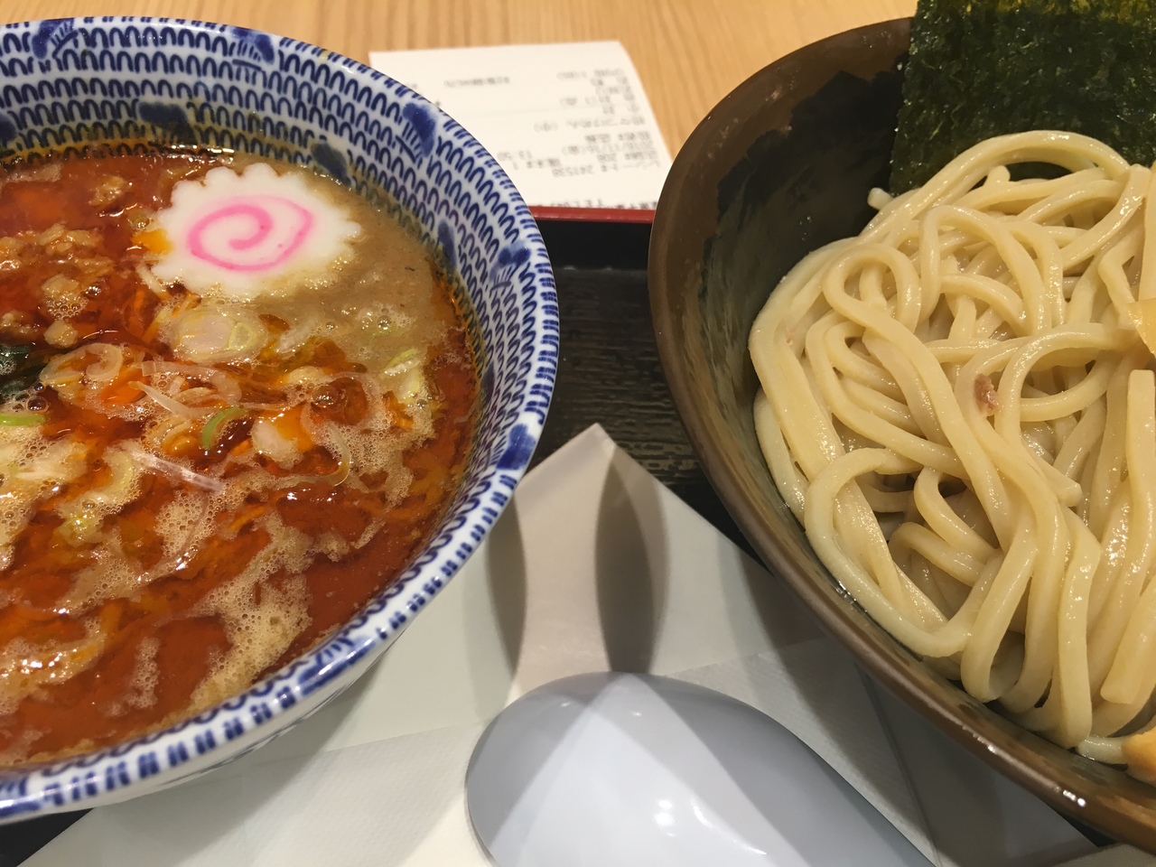 今回は坦々つけ麺を注文しました。通常のつけ汁に胡麻ペーストのようなものと、ラー油のような赤い油が浮いています。