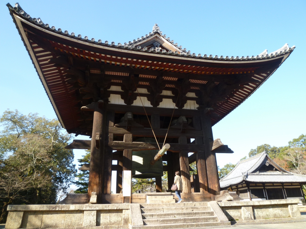 鎌倉時代の鐘楼に奈良時代の梵鐘、共に国宝で大きな建造物です。鐘楼は、一段高い所に屋根が反り返った歴史を感じ、柱も人より太く組み立てがすばらしいです。梵鐘も大きく、迫力があります。国宝の鐘を国宝の建造物で吊る、すばらしい景観です。