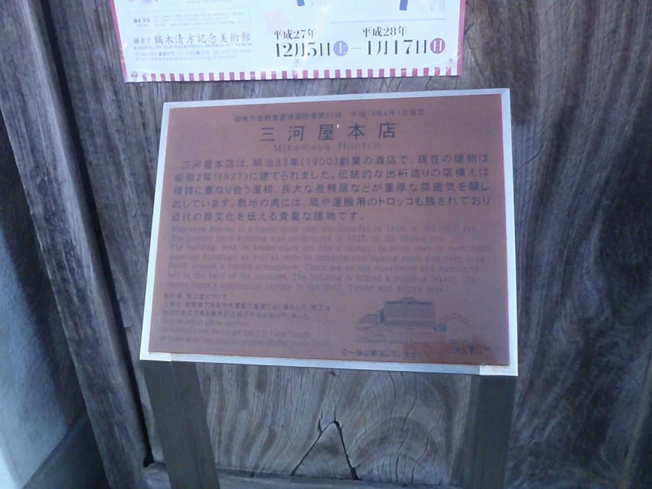 若宮大路を鶴岡八幡宮に向かって二の鳥居から400m左側、伝統的な建築法出桁造りという複雑に重なり合う屋根、長大な差鴨居などが重厚な雰囲気を醸しだしているのが鎌倉市景観重要建築物三河屋本店第22号指定の三河屋本店です。