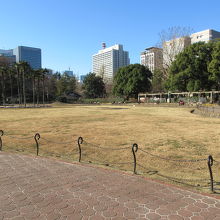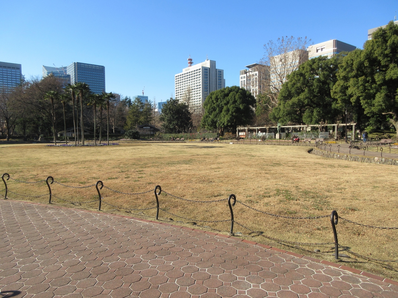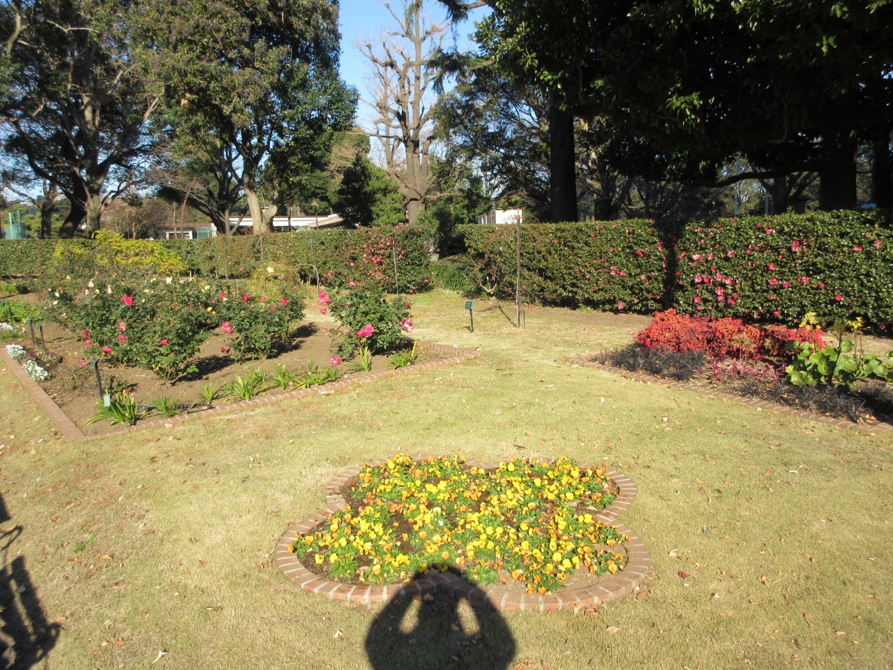 日比谷公園内に2つある、バラを中心とした広い花壇の1つです。開園当時から同じ形を守っている、日本で最初の洋式花壇です。歴史的には関東大震災後に被災者のバラックが並んだり、2・26事件の際にはシュロの木が伐採されたりしたようですが、現在は洋風のペリカン噴水が設置されたり、パンジーやバラ、ツバキなどが植えられ、花壇周辺にはベンチも置かれ、平和を象徴している花壇です。周辺で働くビジネスマンや観光客の憩いの場にもなっています。訪れた1月はバラも咲き残っていましたが、芝は枯れていました。春から夏にかけては多くの花でにぎわうことと思います。