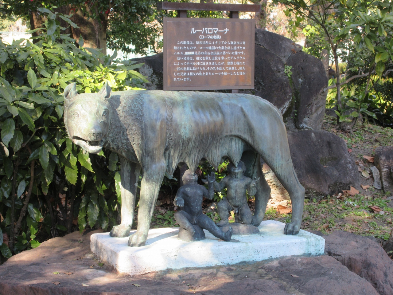 日比谷公園第一花壇に置かれた自由の女神像の後ろにある、ロックガーデンの中に像が建っています。ローマ帝国を建国した二人の兄弟が、幼い時にオオカミの乳を飲み成長したという、ローマの神話に基づいて造られた像で、昭和13年にイタリアから贈られたそうです。なぜ日比谷公園に設置されているのかはわかりませんが、幼い少年のあどけなさと堂々と力強いオオカミの姿が印象的な像です。