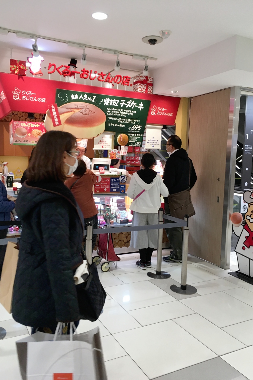 大阪にしかないチーズケーキのお店のりくろーおじさんの店。大丸梅田店は大阪駅の上だけあって非常に混雑しています。ただ、クリスマスの時期は1時間以上並ぶものすごい混雑でしたが、お正月明けのせいかさほど混雑していませんでした。