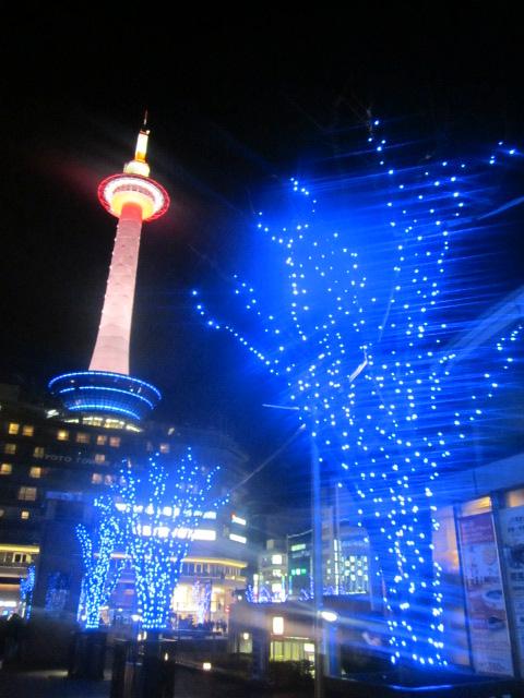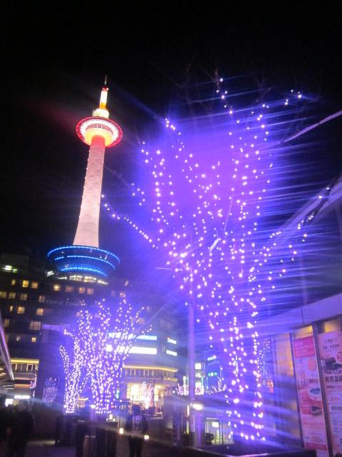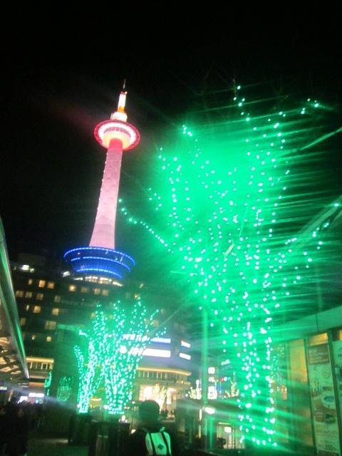 夜遅い到着になりましたが、22時を過ぎても、まだ京都タワーはライトアップされていて、手前の木々のイルミネーションも、色を変えながら輝いていたので、その姿を数分滞在して見ていましたが、写真を撮ってみると、とても幻想的なアングルで撮れたのが良かったです。ただ、流石に京都駅前なので、人波を避けて撮影するタイミングが難しかったですが…。
