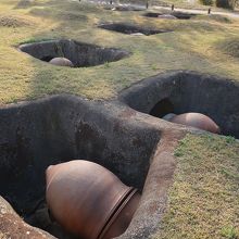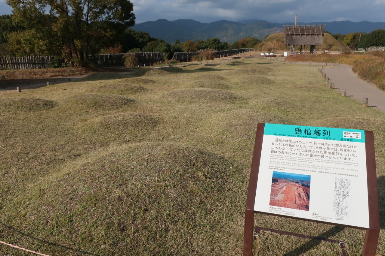 吉野ケ里遺跡には甕形をした棺桶を使って埋葬された墓がいくつかあります。これらが甕棺墓列です。火葬することなく甕の形をした素焼きの土器でできた棺に亡くなった人を収め2列に埋葬した形態は弥生時代の北九州地方だけだそうです。遺跡では地中に甕が置かれた状態しか見られませんが、北墳丘墓の展示室では埋葬時の姿を再現したものが見られます。