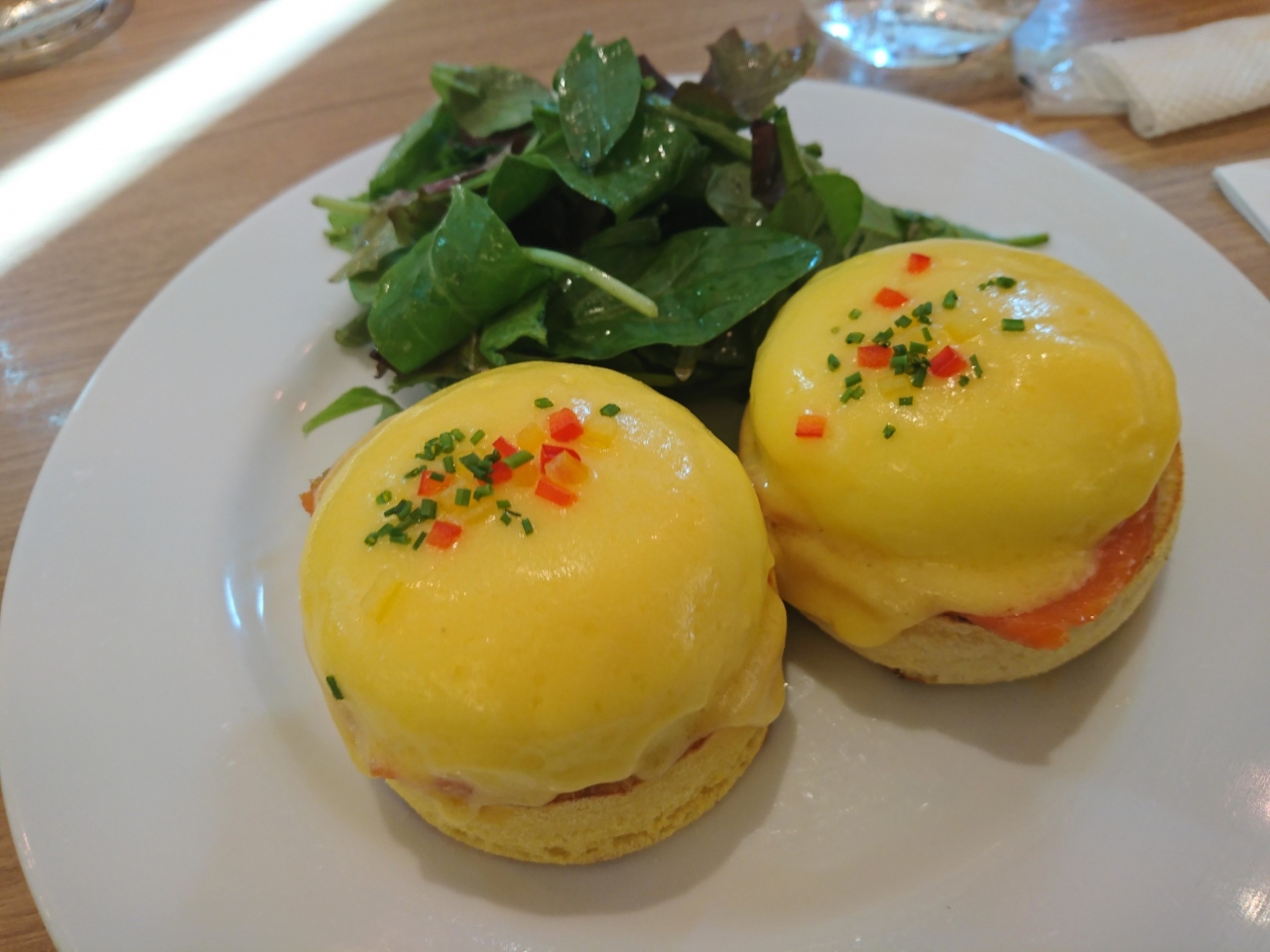 とろーり溶ける卵とサーモンの愛称が抜群でした。また付け合わせの野菜(ルッコラ?)が私的には大ヒット。