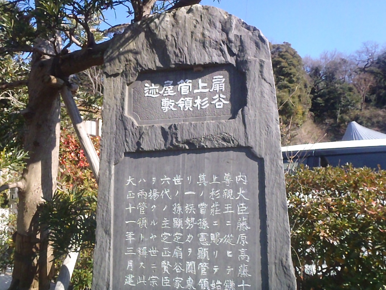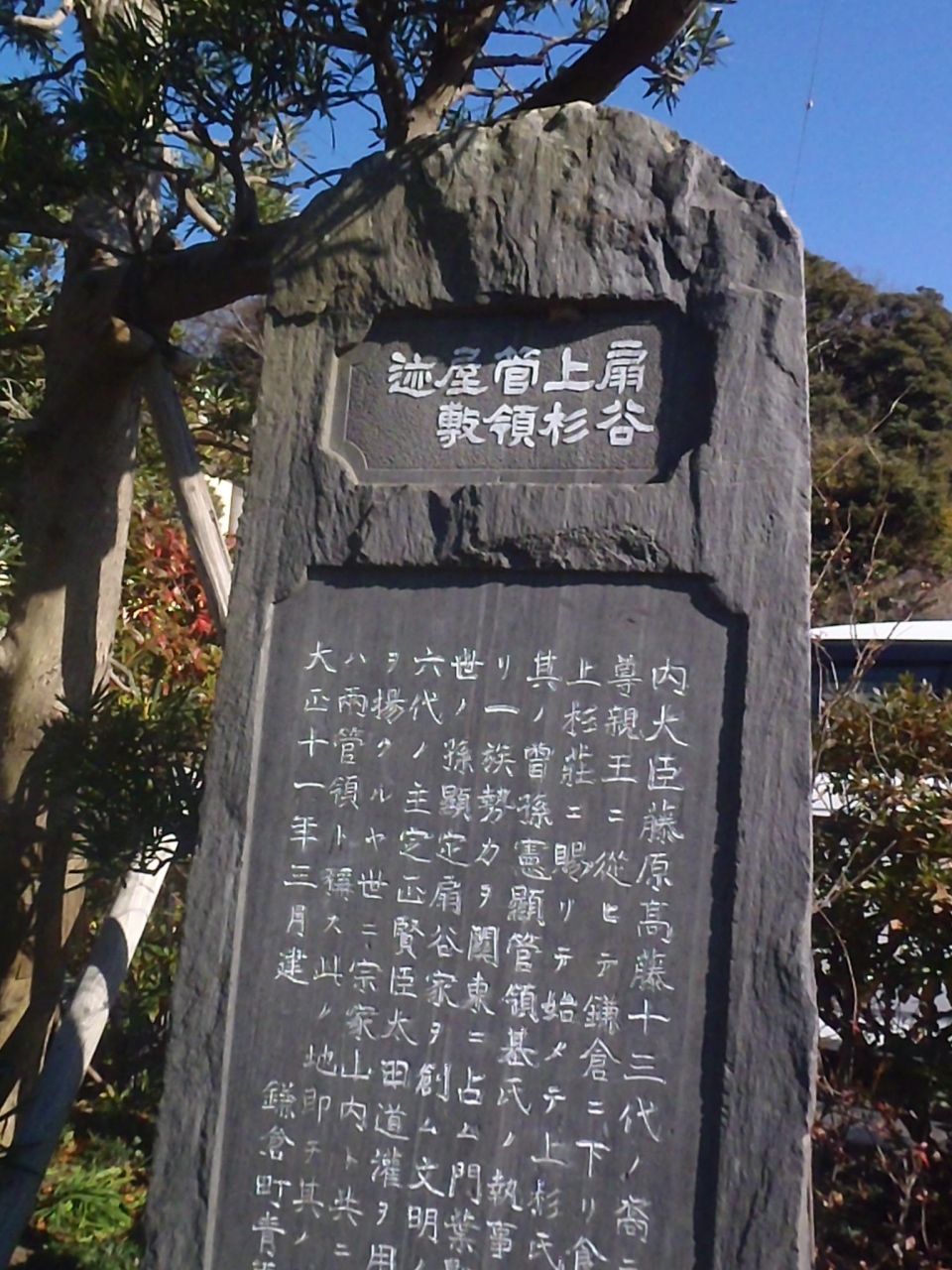 江ノ電鎌倉駅から約1km扇ガ谷2丁目に立つ鎌倉の史跡碑、石碑に書かれている内容はなんかい難解、調べてみたが難解、ようするに上杉憲顕が将軍基氏の高官となり一族の勢力が関東に広がり重房から5代後の顕定は扇谷家を起こし世間の人々は山内家と共に両上杉または両管領よびこの場所がその屋敷がった跡です。