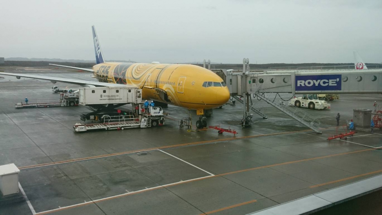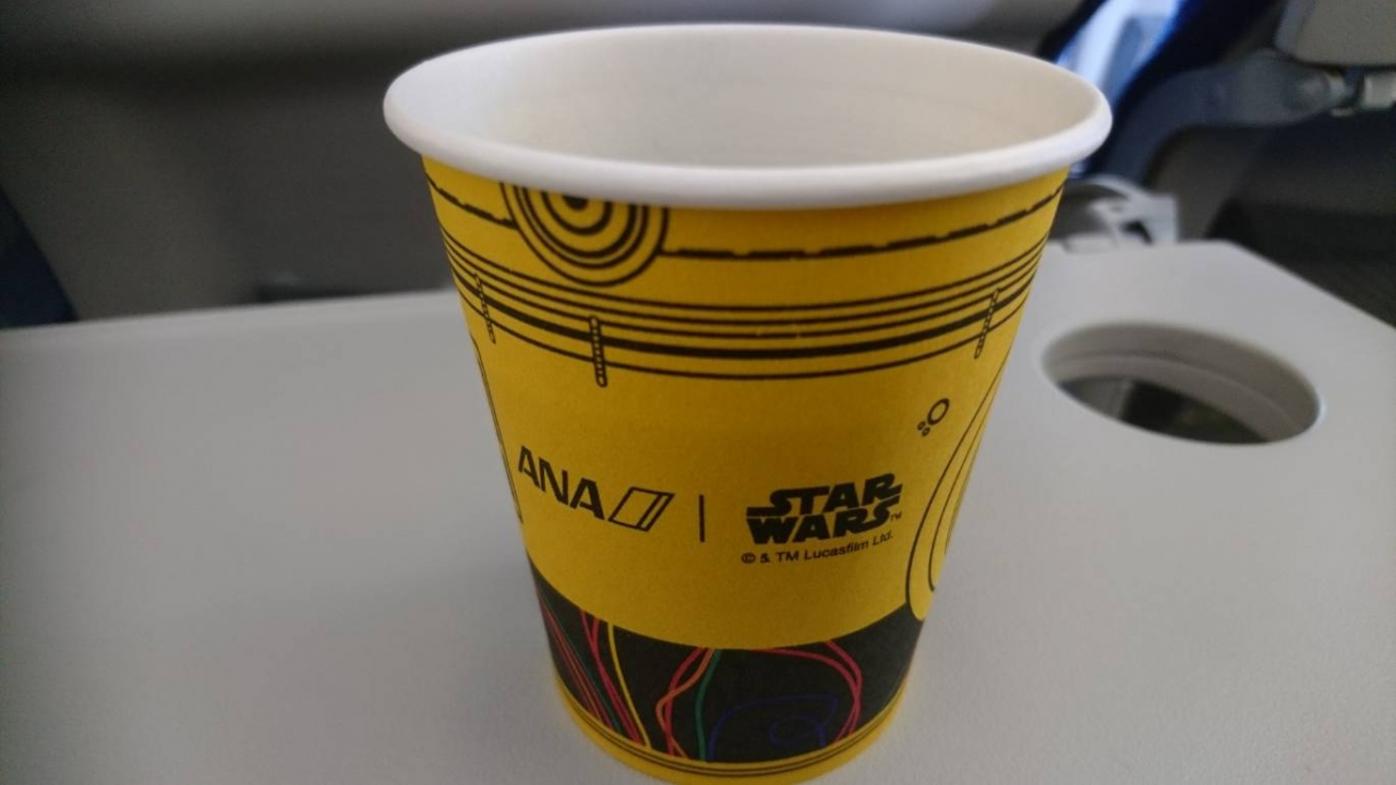北の玄関口、新千歳空港。今回は、ここから東京へ向け旅行です。搭乗手続きをし終わって、飛行機に案内されると、驚いたことにスターウォーズの飛行機でした。スターウォーズファンとしては、飛び上がるほど感激です。これは幸先の良い旅になりそうです。追伸、飛行機の中で出された飲み物の容器もスターウォーズでした。