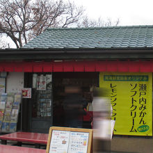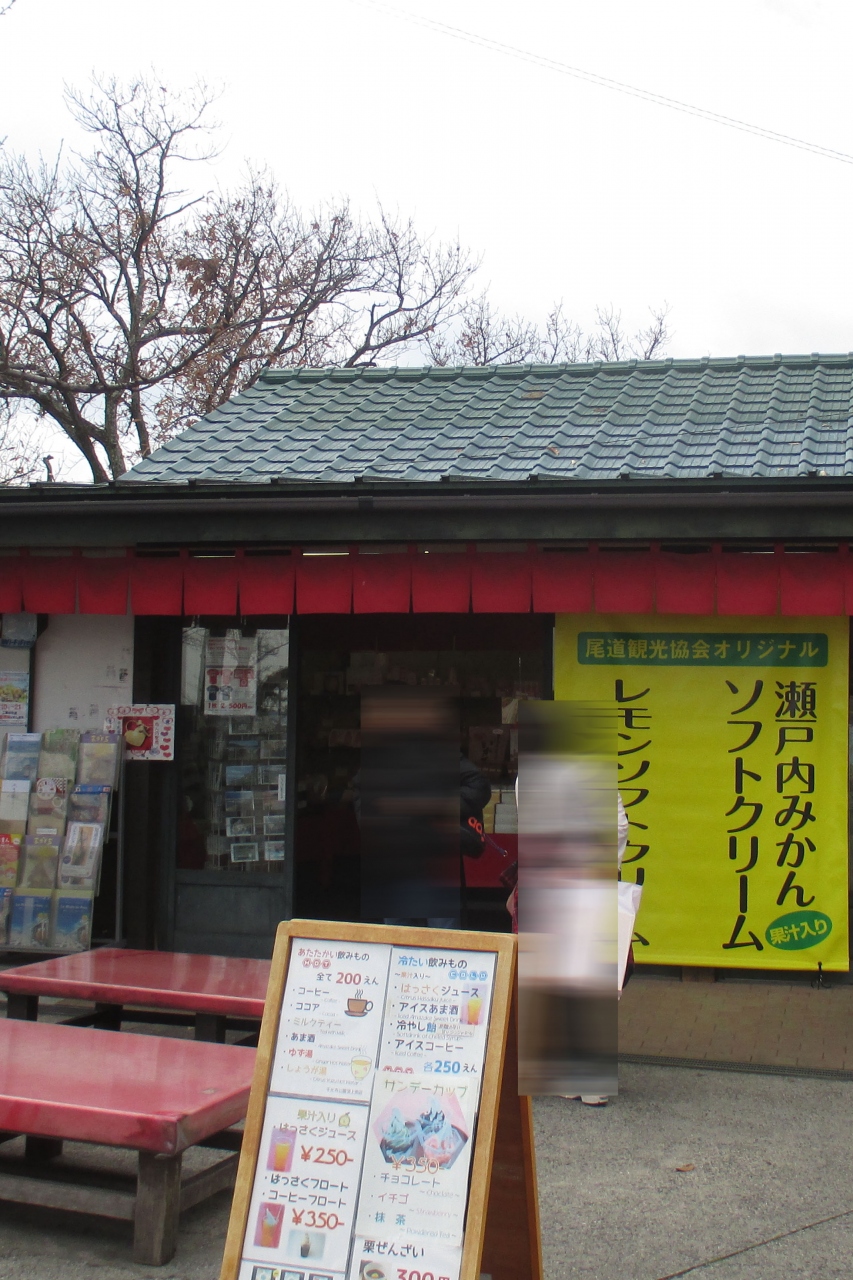 頂上売店は観光協会の直営店だそうで、店内には尾道(プラス近隣の島)のお土産品が並べられていました。そこまでは普通の観光売店ですが、外の大きな暖簾看板にはソフトクリームと書かれていて、飲み物系を書いた立て看板には、コーヒーや甘酒もありましたが、全体の3/4はすべて冷たいメニューで埋められていました。尾道の人はそんなに冷たいものが大好き?なのかと思いました。