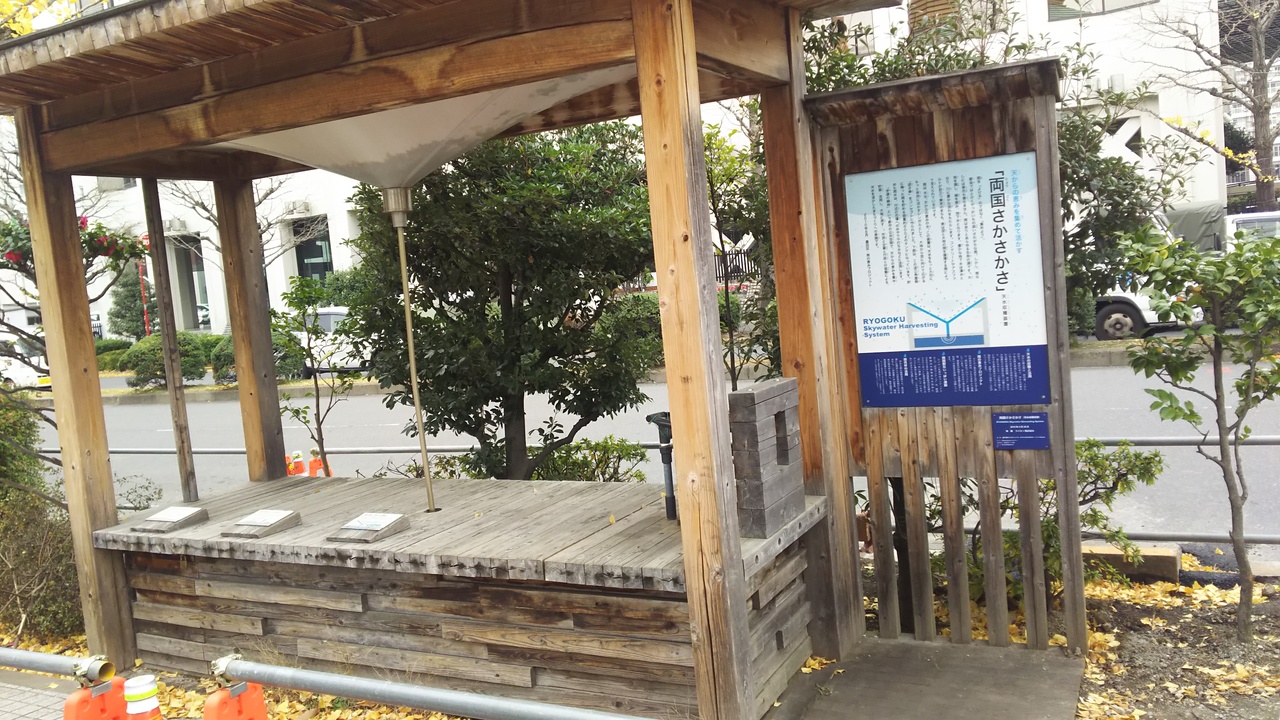 機械の上にこうもり傘つまり、逆さ傘のようになった屋根がついていて、そこに降った雨を集めて、下にあるタンクに貯め、それを花壇の水やりに使っているみたいですね。
