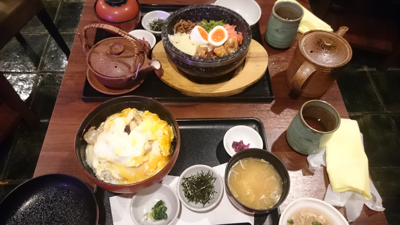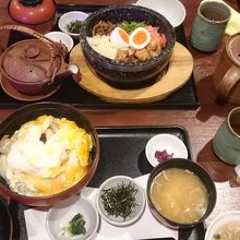 親子丼と水炊きのスープがついた鶏飯を注文。始めに切り干し大根に鶏ひき肉が入った小鉢がきました。すぐにメインも登場。親子丼は鶏肉が焼いてあり卵でとじた物。とても上品な味でした。鶏飯は石鍋に入っていてあつつ、そこに鳥スープをかけて頂きます。