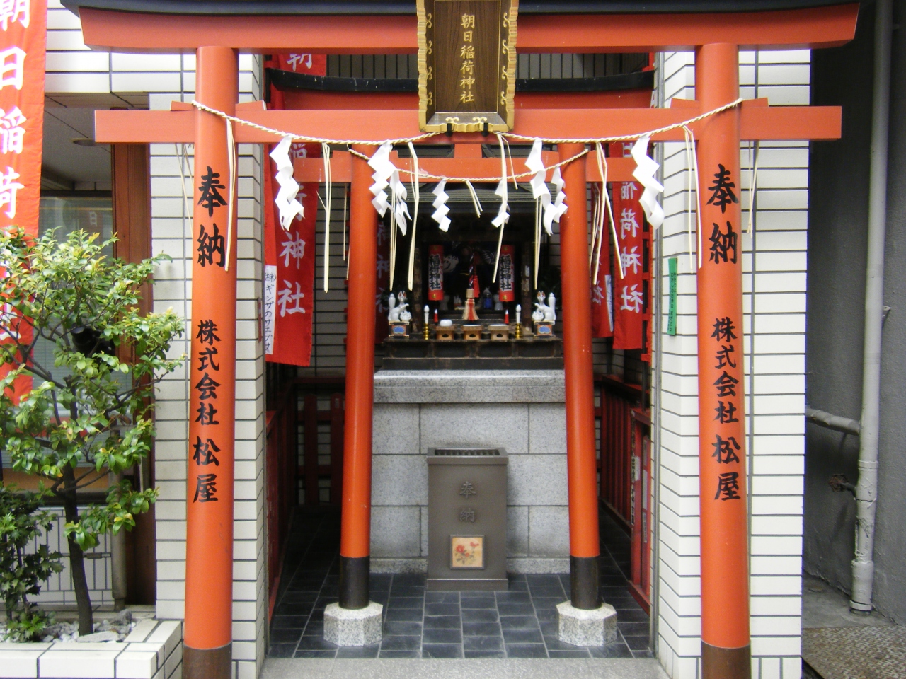 銀座三越の裏手にある松屋通りと銀座三原通りが交わる交差点の一角に朝日稲荷神社はあります。ビルの一部に食い込むように存在している神社で、規模は非常に小さく、参拝している人も私以外にはおりませんでした。銀座周辺の神社はこういった形(ビルの一部に組み込まれたような形)の神社が多く、ちょっと落ち着かない雰囲気があるのですが、仕方ないのですかね。