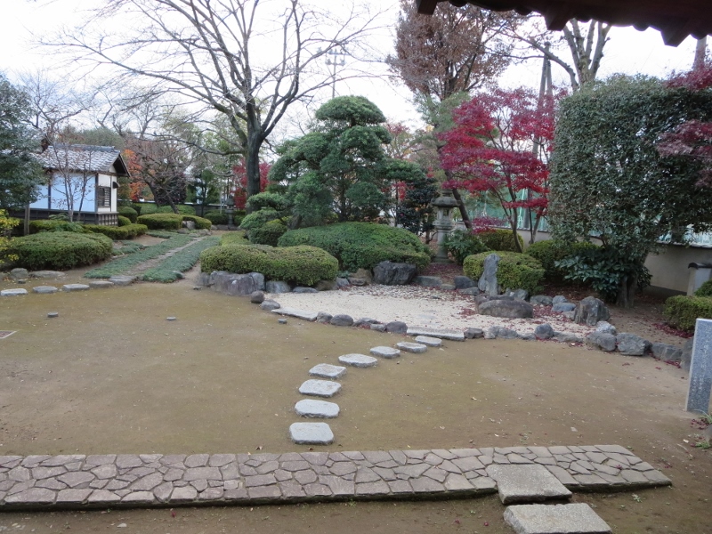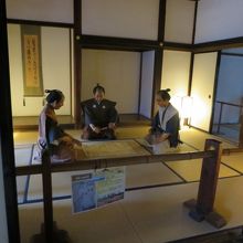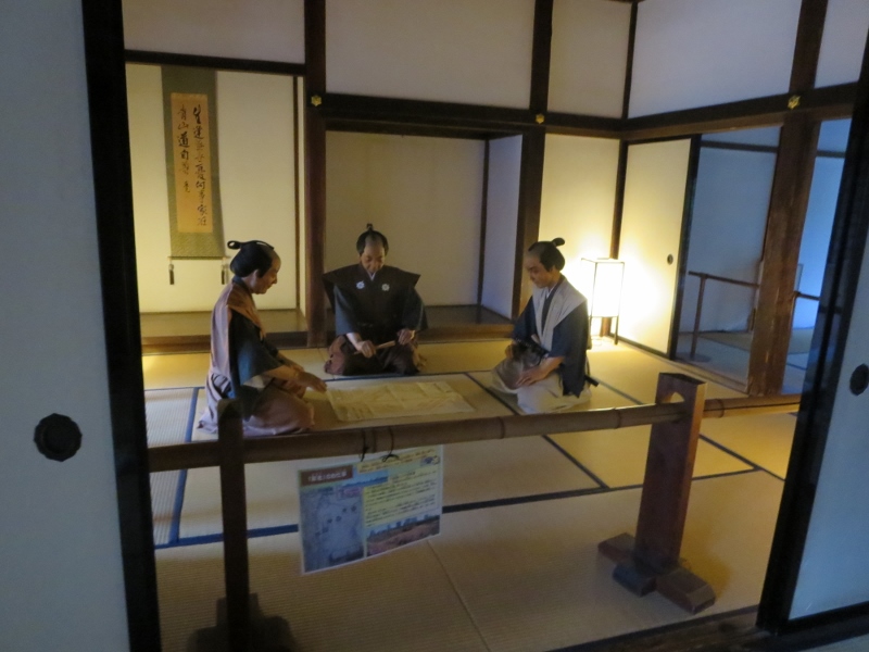 城ということですが、それほど広くない平屋なので屋敷という感じでした。奥の座敷では、何か会議をしているような雰囲気で侍の人形が配置されていました。12月でしたが庭には遅めに色づいた紅葉も見られました。縁側に座って眺めてきました。